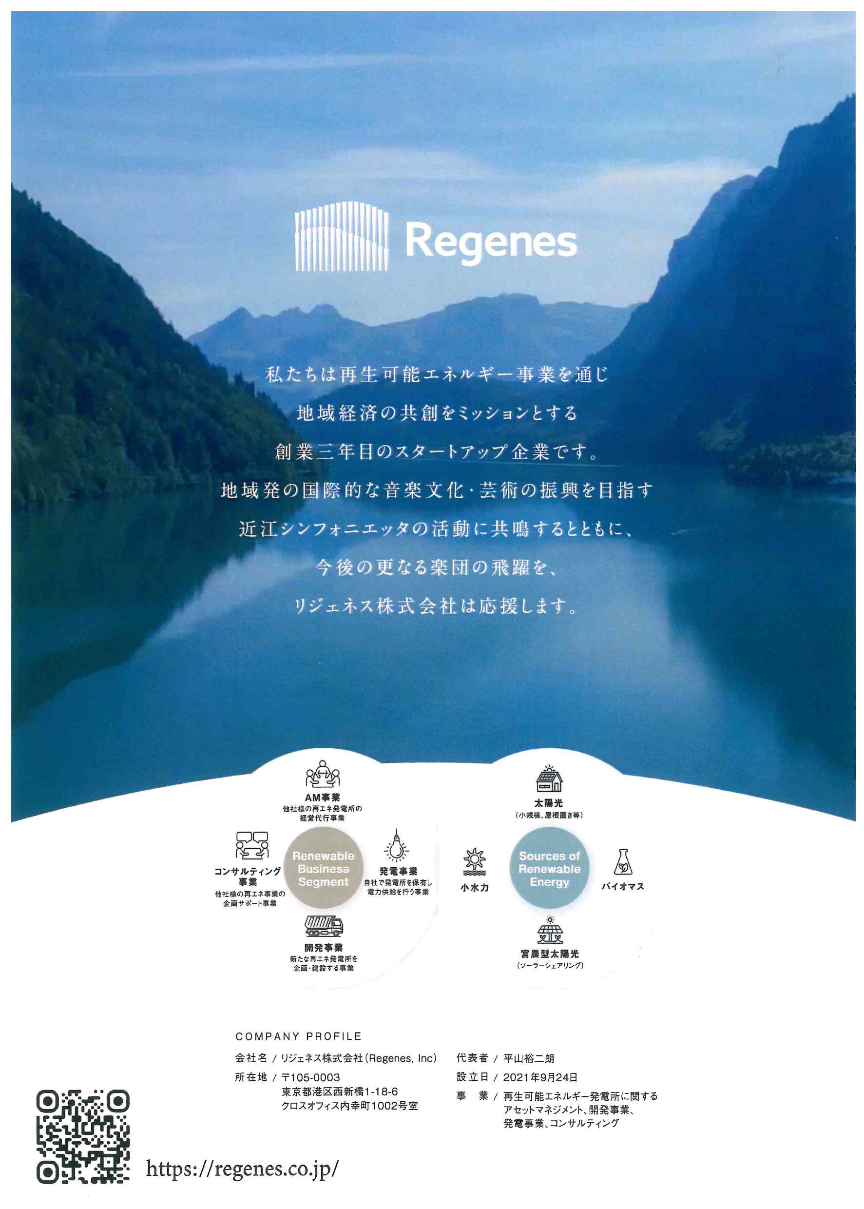 このたび、リジェネス株式会社は、昨年に引き続き滋賀県発のプロフェッショナルオーケストラ『近江シンフォニエッタ』への協賛を行いましたことをお知らせいたします。